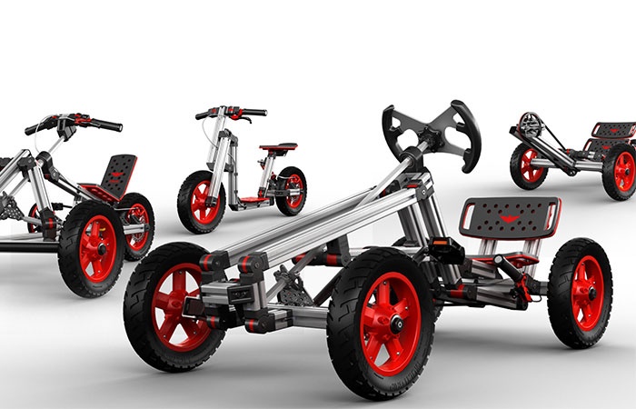 Denk aan technische LEGO of het old-school Mecano maar dan voor voertuigen en dan heb je een idee van wat Infento is. Je krijgt een bouwpakket met allerlei onderdelen en daarin zitten ook verschillende handleidingen waarmee je driewielers, fietsen, steps en bijna alle andere voertuigen met wielen mee kunt maken.